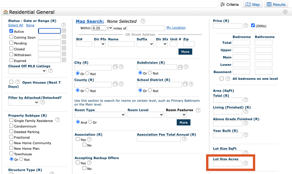 - In Matrix, go to Search → Residential. In the main search fields, you’ll see a preset field labeled Lot Area Acres. Enter your desired range (for example: 1–5 acres) to filter results. This helps you quickly find listings that match the amount of land your clients are looking for—without searching listing by listing.